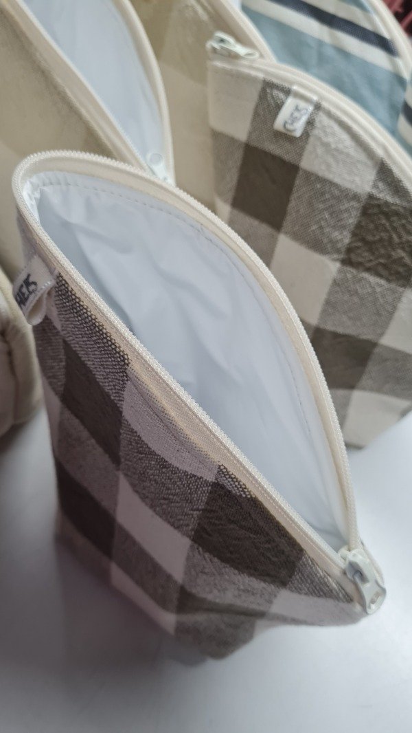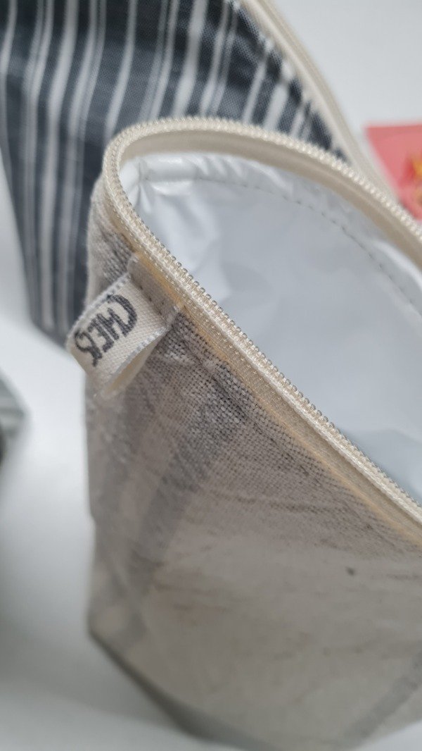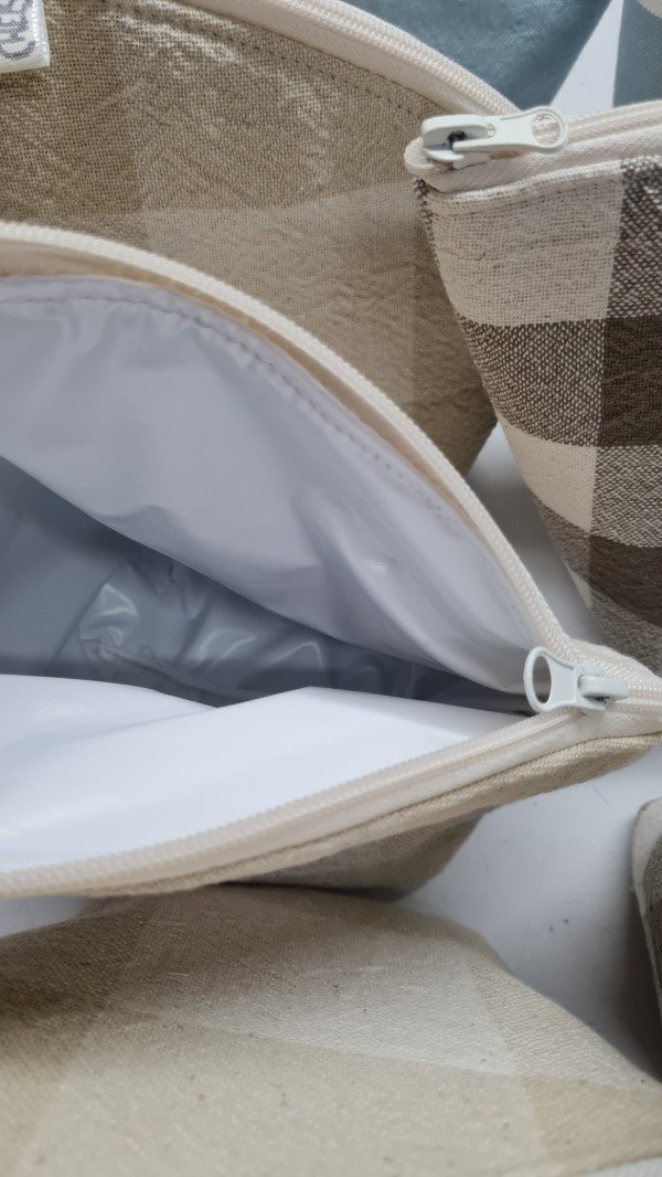 Yerbera confeccionada artesanalmente, en su interior tiene tela para que quede firme (no rígida, se puede doblar para su fácil guardado) y no se caiga y por dentro tela impermeable de fácil lavado