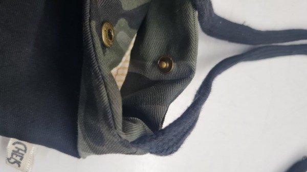 Portacel con broche metálico y bolsillo delantero, confeccionado con gabardina negra y camuflada y rallada en su interior