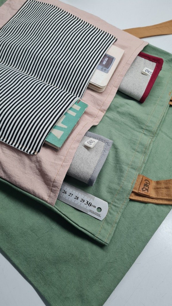 Tiene 4 bolsillos frontales correa de la misma tela, liso 30cm largo y rayado 20 cm largo